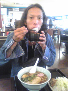 画像は甲賀流のねぎソース、ご飯を頬張るリーダーと機材車で爆睡中のジュン(笑)